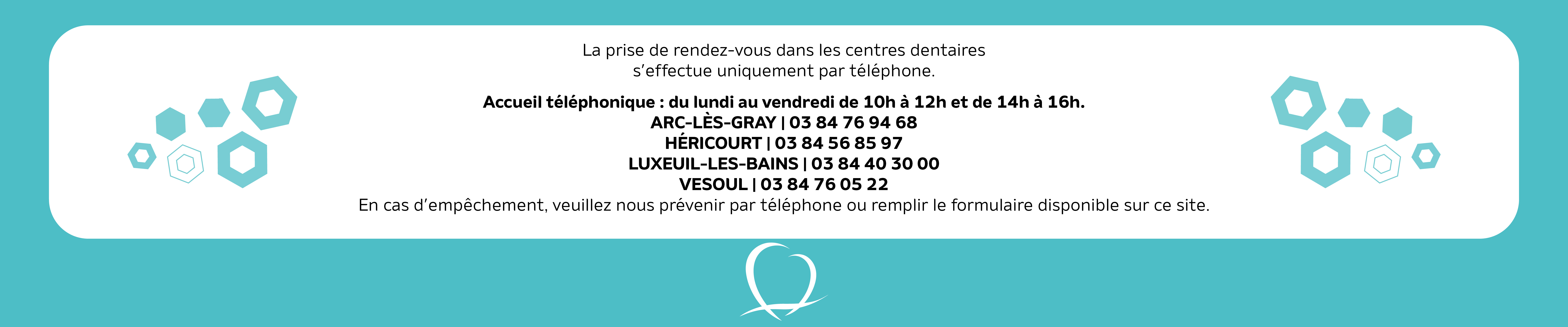 - Les centres de santé dentaire sont accessibles uniquement aux personnes ayant pris préalablement rendez-vous par téléphone (accueil téléphonique : du lundi au vendredi de 10h-12h et de 14h-16h) et pris connaissance des modalités d'accueil disponibles en cliquant ici.